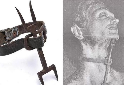 Furca lui Heretic: dispozitivul de tortură era utilizat în Spania Medievală și era realizat din metal cu două ramificații opuse și fixate cu ajutorul unei curele pe gâtul celui care urma să fie pedepsit. Acesta era montat între piept și gât, victima fiind obligată să stea într-o poziție nefirească până când corpul îi ceda.
