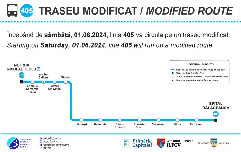 La solicitarea călătorilor, Asociația de Dezvoltare Intercomunitară pentru Transport Public București – Ilfov (TPBI) a dispus prelungirea liniei 405, de la actualul capăt – Glina, la Spitalul Bălăceanca, precum și suplimentarea parcului de vehicule. Măsura va intra în vigoare de sâmbătă, 01.06.2024, iar autobuzele vor circula pe traseul: terminal „Metrou Nicolae Teclu”, Bd. Theodor Pallady, Sat Cățelu, Șos. Libertății, DNCB, DJ301A, […]
