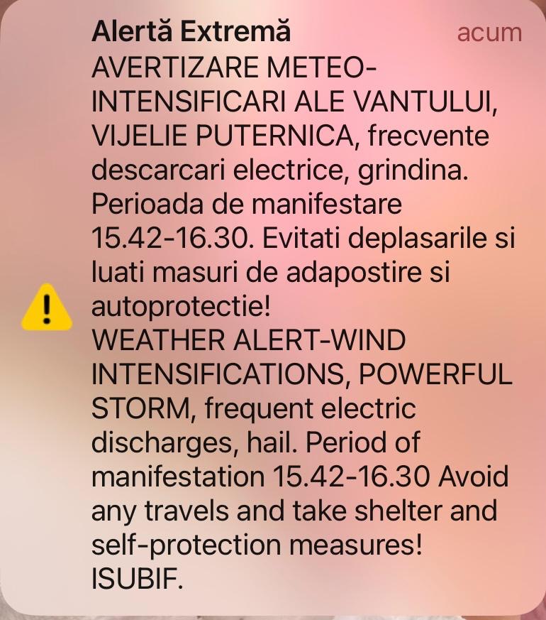 Un mesaj RO-ALERT de vreme severă a fost trimis în București. Avertizarea, valabilă până la ora 16.30.